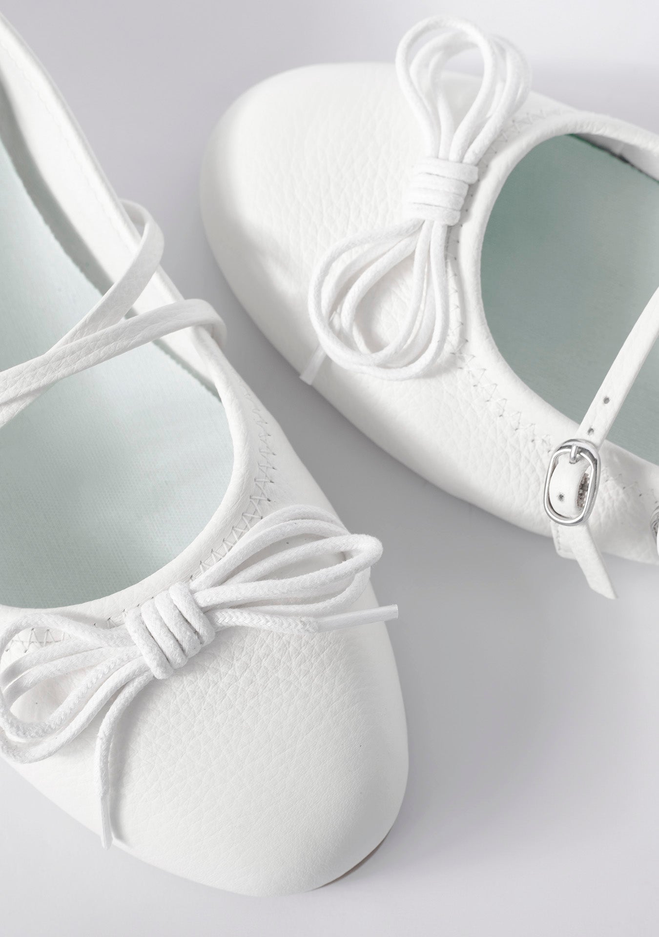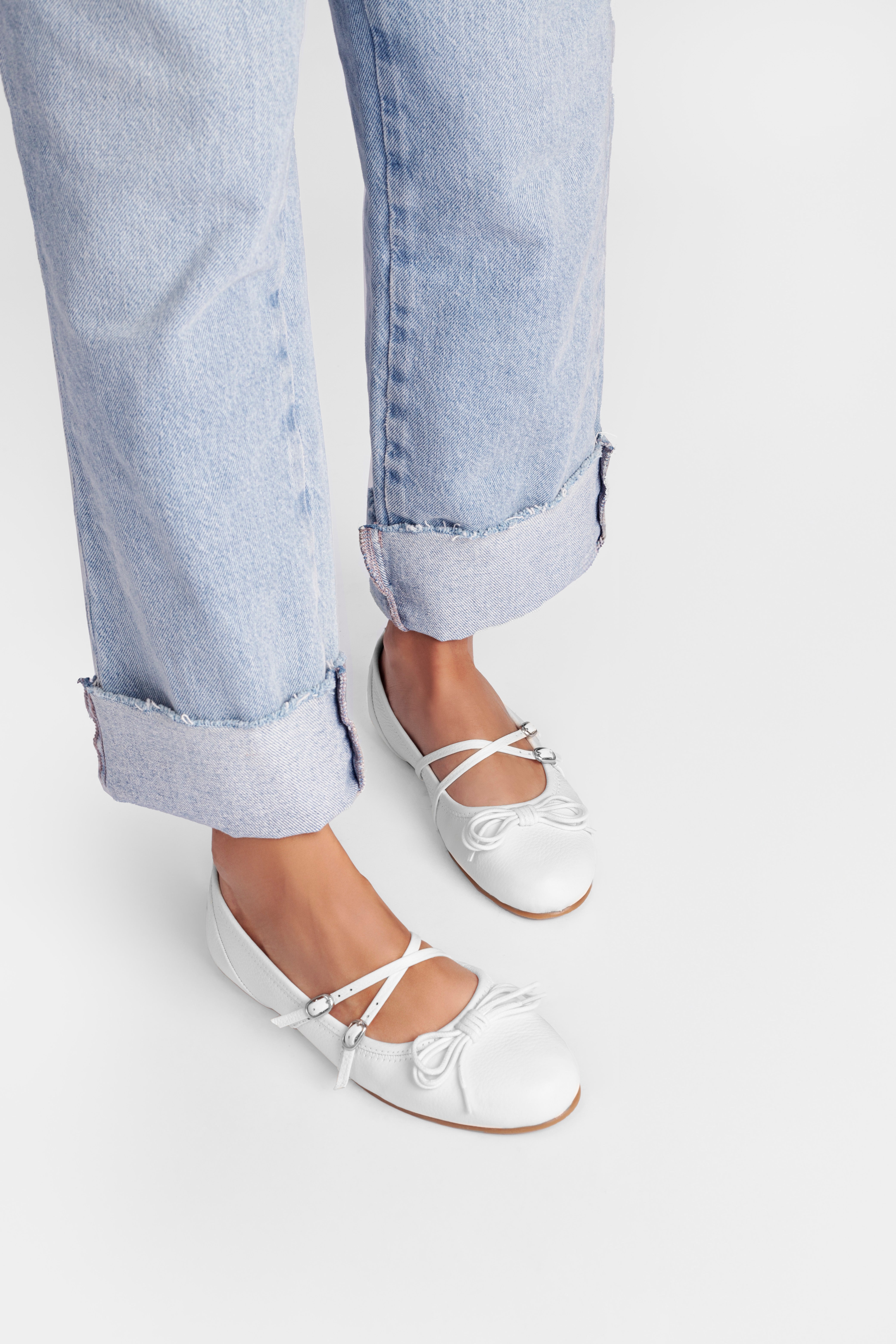 Ballerina COCO en cuero 100% natural con grano suave y acabado mate; diseño Mary Jane minimalista con lazo tubular hecho a mano, correa fina ajustable y hebilla metálica pulida. Borde con pespunte zigzag, plantilla acolchada tipo memory y suela flexible antideslizante de bajo perfil para comodidad todo el día. Estética limpia y versátil que eleva denim, sastrería ligera o vestidos. Serie limitada: 6 pares por modelo. Ideal si buscas ballerina blanca de cuero con detalles finos y calce cómodo.