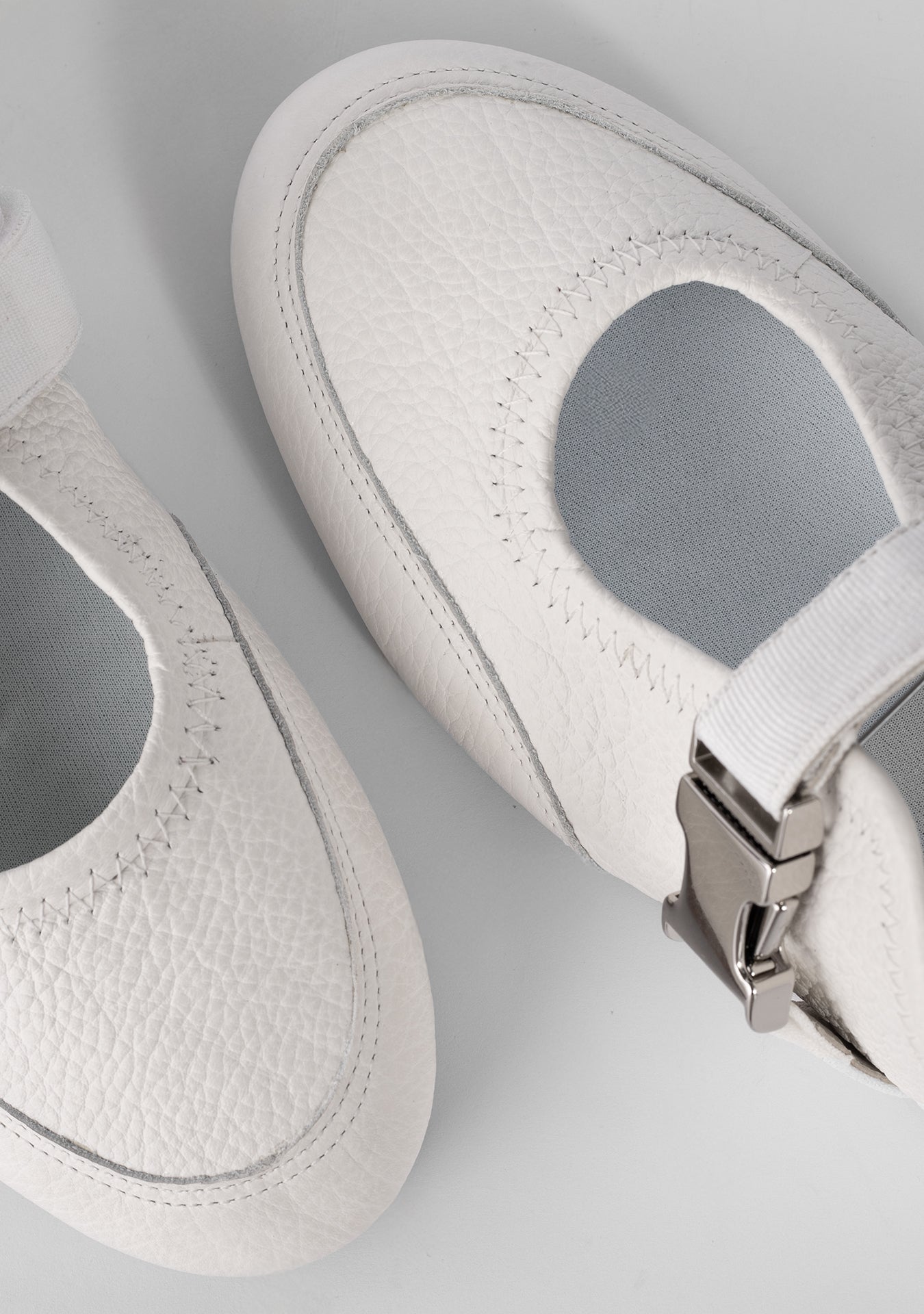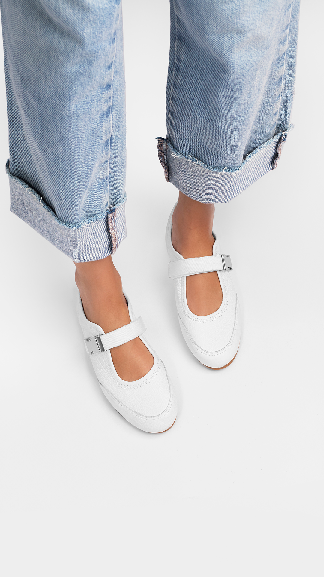 Ballerina REVIVER Blanca en cuero 100% natural graneado: silueta Mary-Jane minimal con correa ajustable y hebilla metálica de liberación rápida, punta redondeada que estiliza sin presionar, plantilla acolchada tipo memory y suela flexible antideslizante para comodidad todo el día. Forro respirable, talón suavemente reforzado y terminaciones hechas a mano en serie limitada, pensadas para un calce suave y ligero. El blanco puro eleva cualquier look —denim recto, falda midi o sastrería neutra— y convierte este flat en tu comodín chic de temporada. Si buscas ballerina blanca de cuero, merceditas mujer o zapatos Mary Jane en cuero con calidad premium, este modelo es para ti.